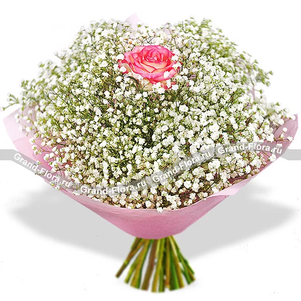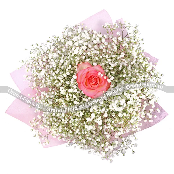 Букет выполнен из воздушной белой гипсофилы и розовой розы сорта Аква, обернутый в фетр в тон розе. Размер букета от 20см в диаметре, до 30 см в диаметре, в зависимости от выбранного Вами варианта букета. Обращаем Ваше внимание, что состав и оформление букета могут отличаться.