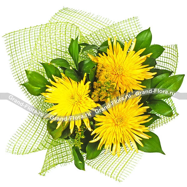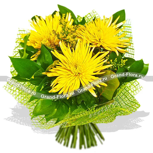 Желтые одноголовые хризантемы составляют центр жизнерадостного букета. Выразительности цветам придают солидаго, салал или рускус. Упакованная в зеленую сетку композиция наверняка порадует получателя в день его рождения. Будьте убеждены, что любой член семьи не устроит перед роскошью букета, будь то Ваши родители или любимые бабушка с дедушкой. Коллега по работе также оценит Ваш безупречный вкус и будет радоваться получению столь шикарного букета. Композиция выразит глубокие чувства благодарности и уважения за Вас.