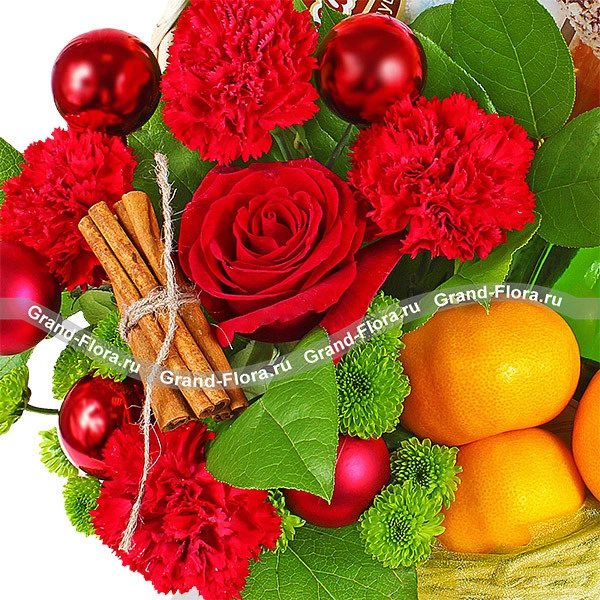 Уменьшенный: гвоздика - 3шт., роза красная - 1шт., хризантема зеленая (сантини) - 1шт., корица, мандарины - 0,5кг., конфеты "Родные просторы" (278 г.) - 1шт., еловая ветвь - 1шт., новогодний декор и зелень, желтый фетр, оазис, корзина малая.