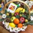 Уменьшенный: Бананы - 0,5 кг, мандарины - 0,5 кг, яблоки зеленые - 2 шт, яблоки красные - 1 шт, лимон - 1 шт, хризантема кустовая ромашковая - 1 шт, роза кустовая белая - 1 шт, шишки - 2 шт, хвоя, шары новогодние "золотые" небольшие - 3 шт, оазис, корзина средняя.